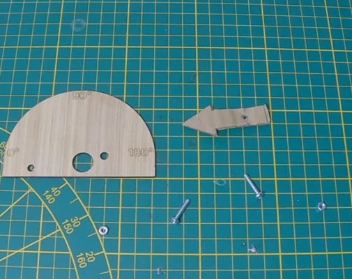 Pour la flèche, j’ai utilisé du carton découpé au laser, car le contreplaqué de 3 mm est trop épais pour fixer correctement la vis de l’attache du servomoteur.