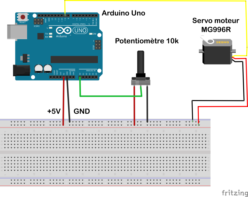 ⚠️ Le MG996R peut consommer jusqu’à 2.5 A : ne pas l’alimenter directement depuis l’Arduino. Utilise une alimentation externe 5V bien régulée, et connecte sa masse à celle de l’Arduino.