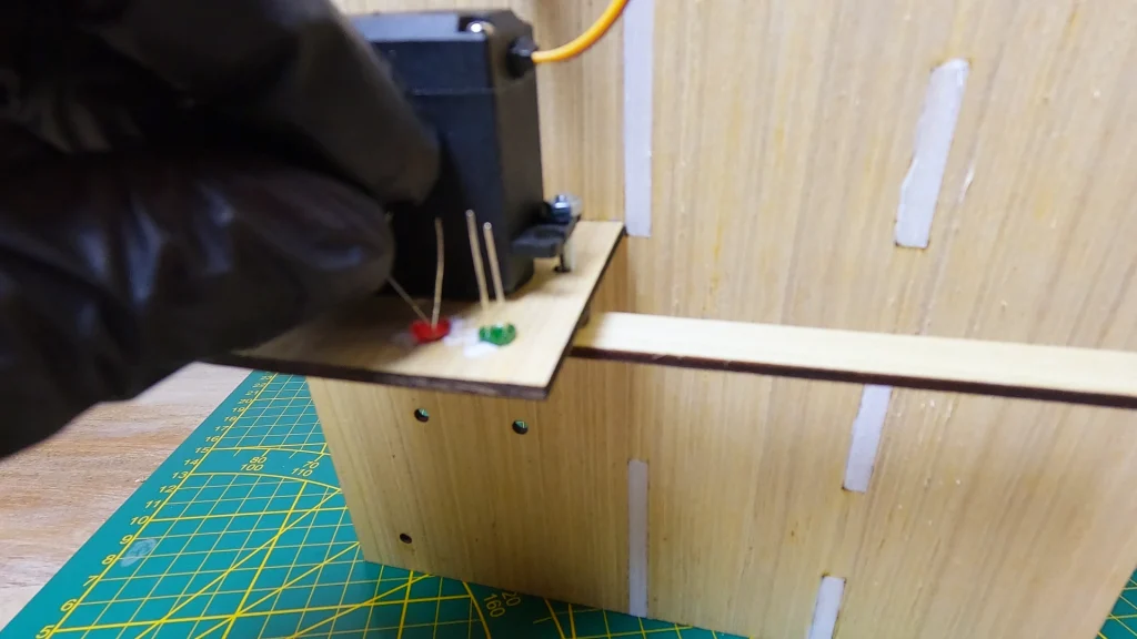Colle le support du servomoteur et des LED sur la maquette. ⚠️ Attention : le trou des LED doit se trouver à droite.