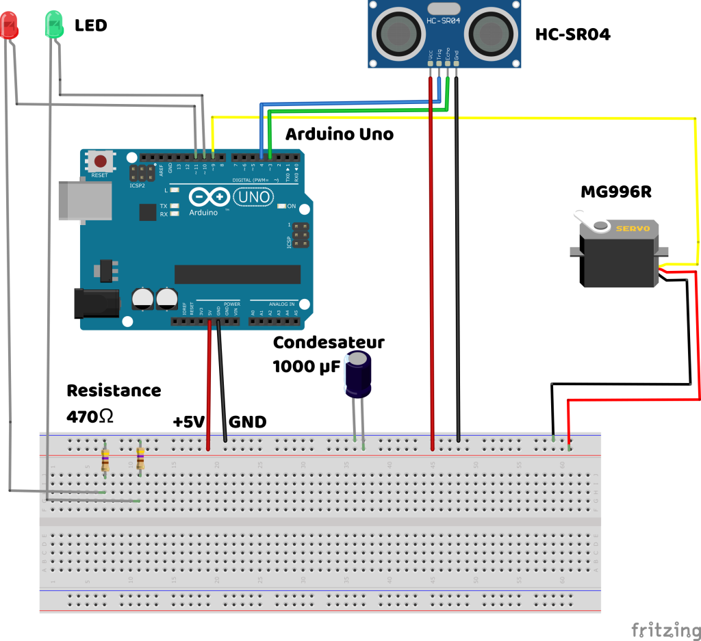 Ce projet Arduino te permet de créer un système de barrière automatique à l’aide d’une Arduino Uno, d’un servomoteur et d’un module à ultrasons HC-SR04. Pour le rendre plus réaliste, des LEDs sont utilisées afin de fournir un signal visuel.